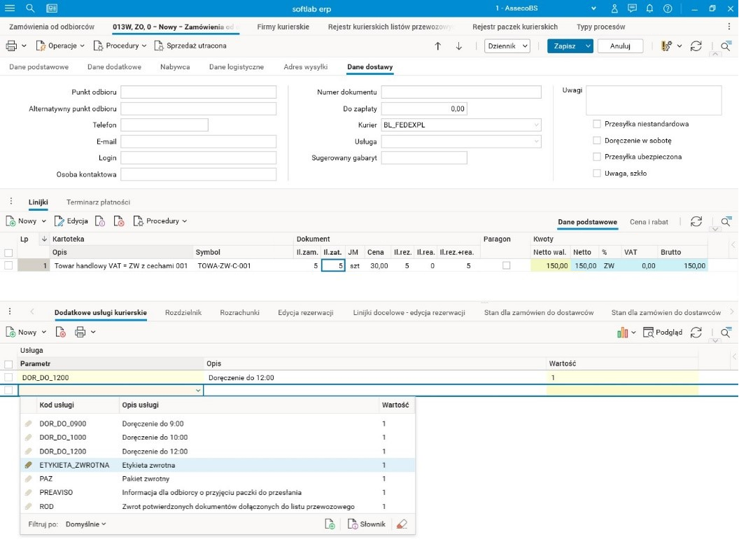 Rys. Szczegół Dodatkowe usługi kurierskie na dokumencie ZO