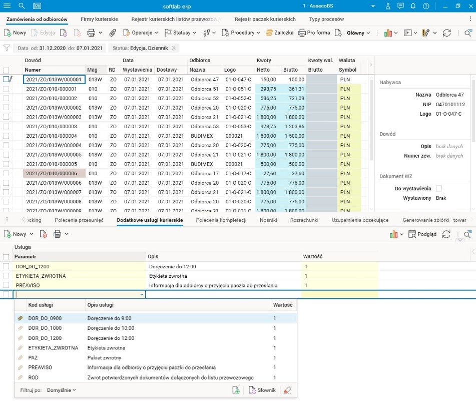 W związku z powyższymi zmianami w słowniku Zamówienia od odbiorców został dodany szczegół Dodatkowe usługi kurierskie. Widoczny jest on zarówno w trybie edycji zamówienia, jak i na kanwie głównej słownika prezentującej wszystkie zamówienia.