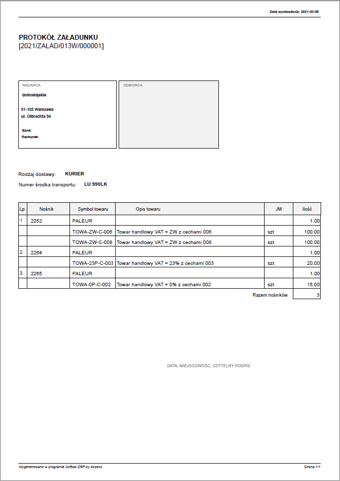 Protokół prezentuje nośniki wraz z towarami, które zostały załadowane do jednego pojazdu i zostaną dostarczone odbiorcom w ramach jednego transportu. Może zostać wykorzystany np. do uzyskania przez magazyn pisemnego potwierdzenia od kierowcy pojazdu, że zabrał on wszystkie nośniki z listy.