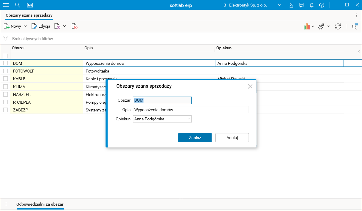 · Jeżeli obszar nie został wybrany lub nie ma przypisanego opiekuna, to opiekun szansy inicjowany jest zalogowanym operatorem.