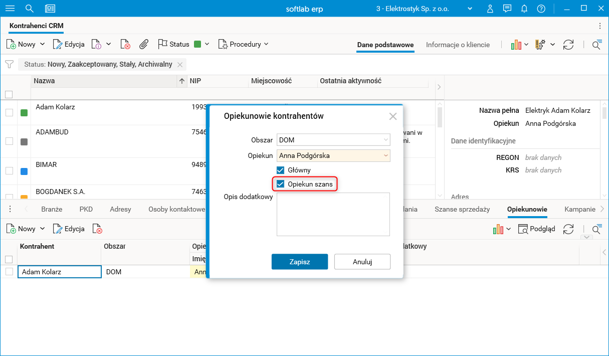 · W pierwszej kolejności system sprawdza, czy do kontrahenta jest przypisany opiekun ze znacznikiem Opiekun szansy (w szczególe Opiekunowie).