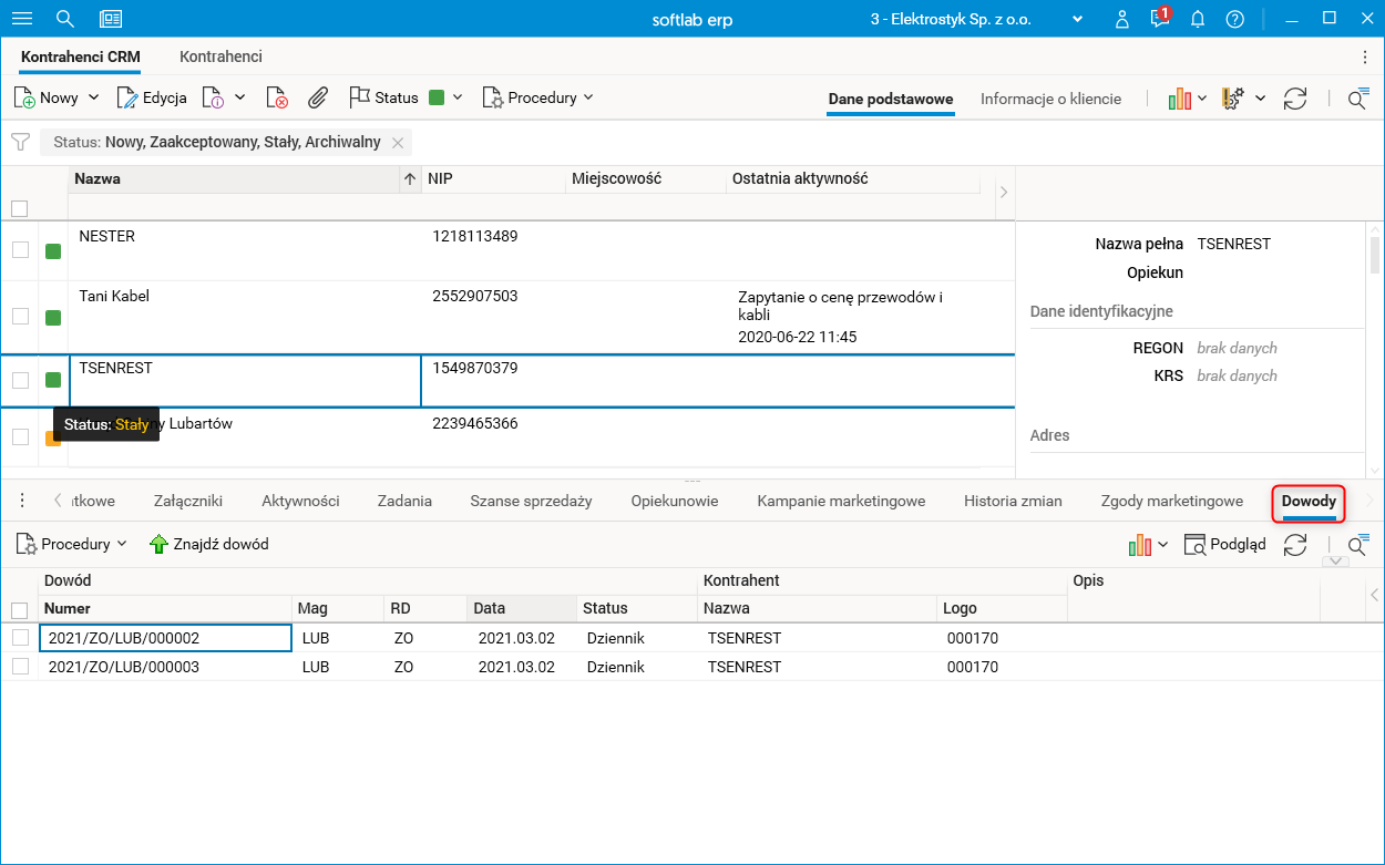 W słowniku Kontrahenci CRM dodano szczegół Dowody przedstawiający dokumenty powiązane z wybranym kontrahentem. Aby dokumenty wystawione na kontrahenta były widoczne, kontrahent CRM musi być powiązany z kontrahentem w słowniku Kontrahenci., co sygnalizuje status kontrahenta CRM o wartości Stały
