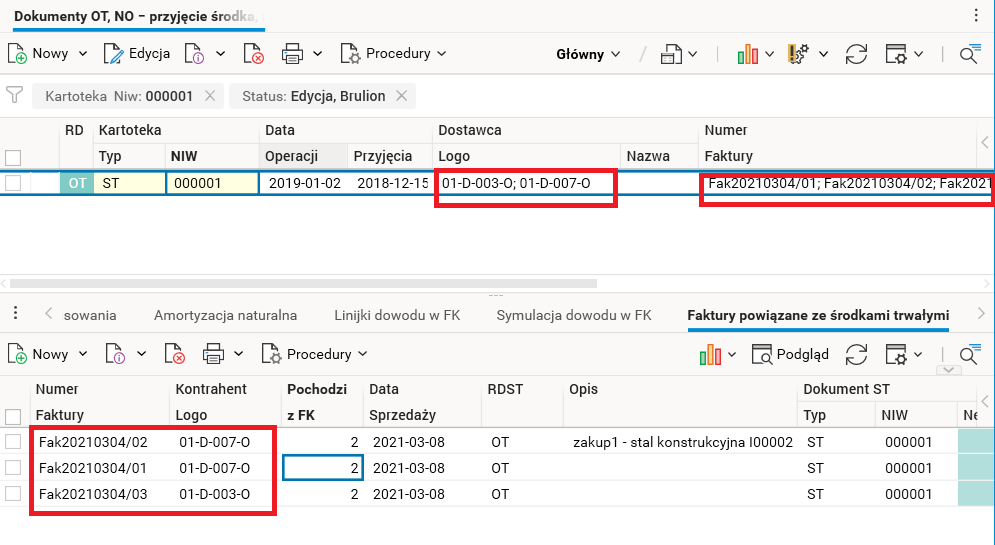 Faktury rejestrujemy w słowniku Dokumenty OT,NO – przyjęcie środka w szczególe Faktury powiązane ze środkami trwałymi.