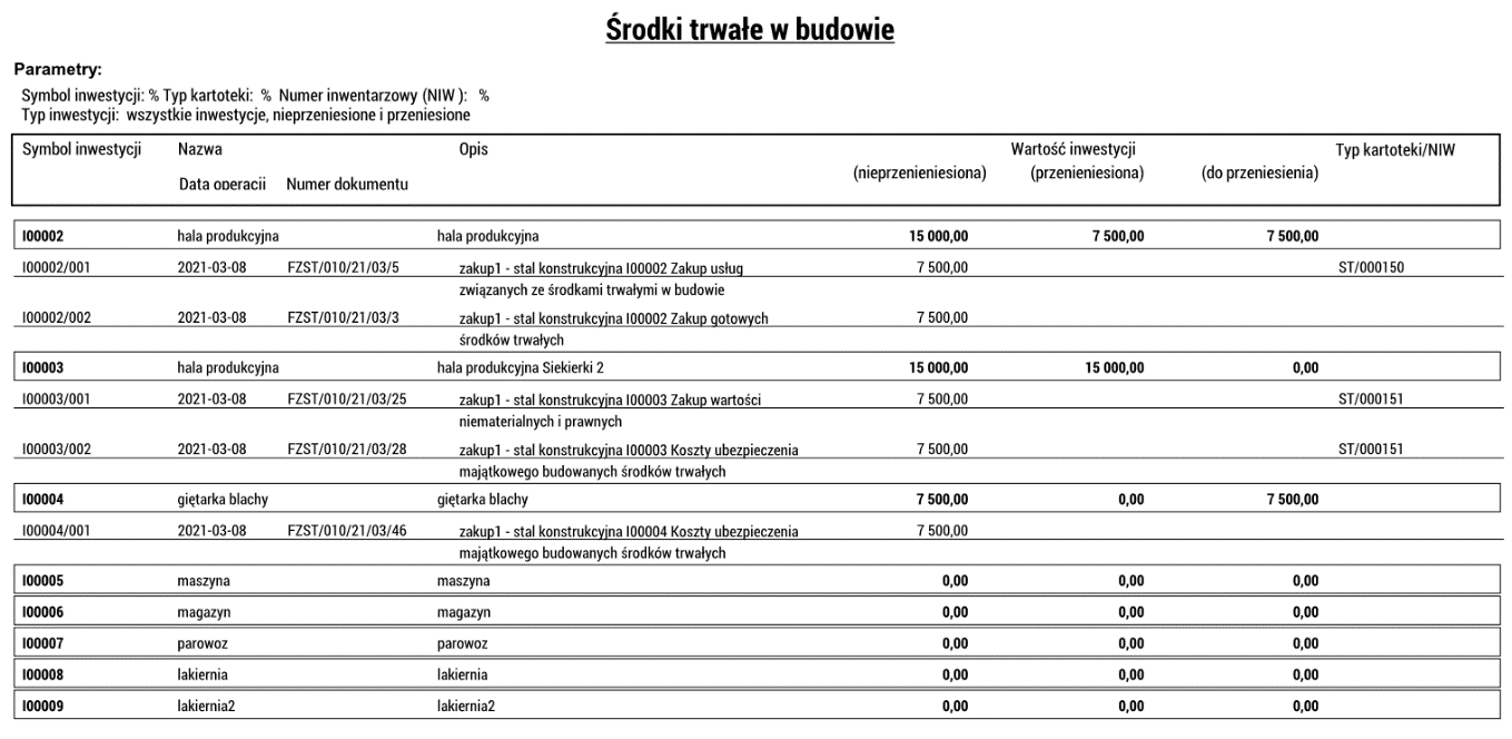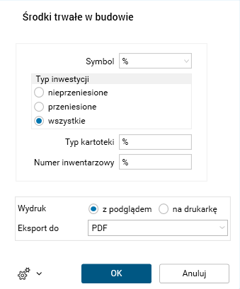 Rys. Okno z parametrami zestawienia Środki trwałe w budowie
