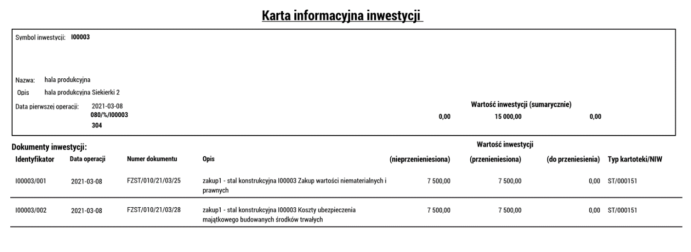 W słowniku Środki trwałe w budowie dostępne jest zestawienie Karta informacyjna inwestycji, w którym wykazywane są dane szczegółowe danej inwestycji.