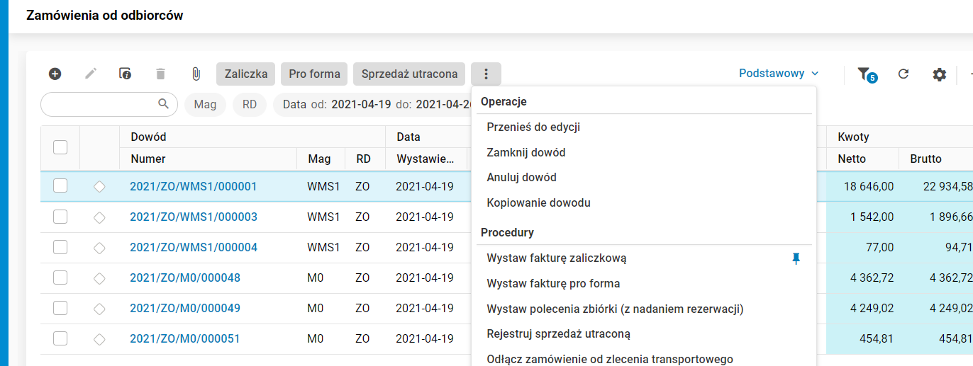 Rys. Lista procedur, ikona pinezki dla procedury Wystaw fakturę zaliczkową
