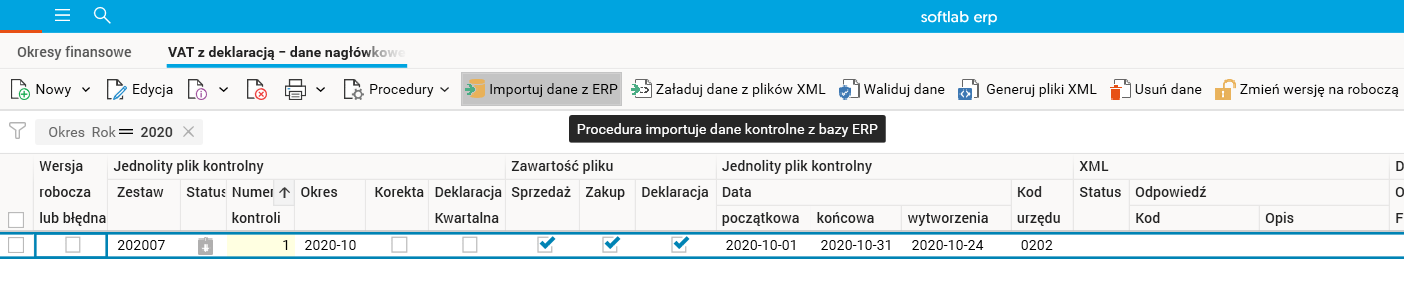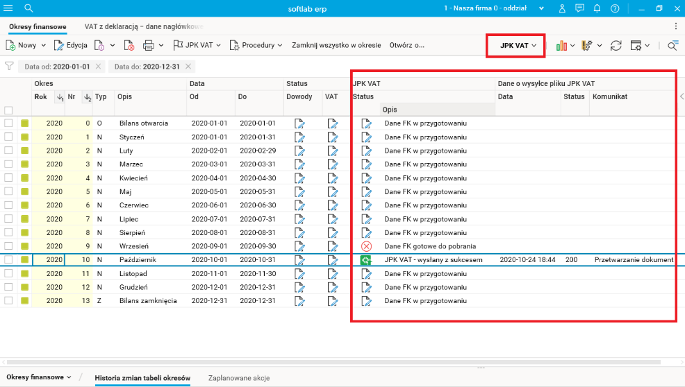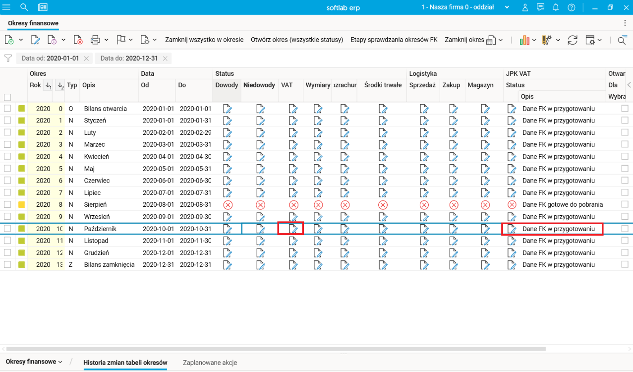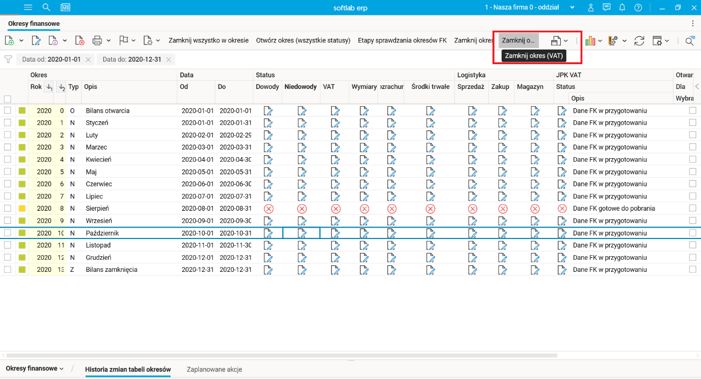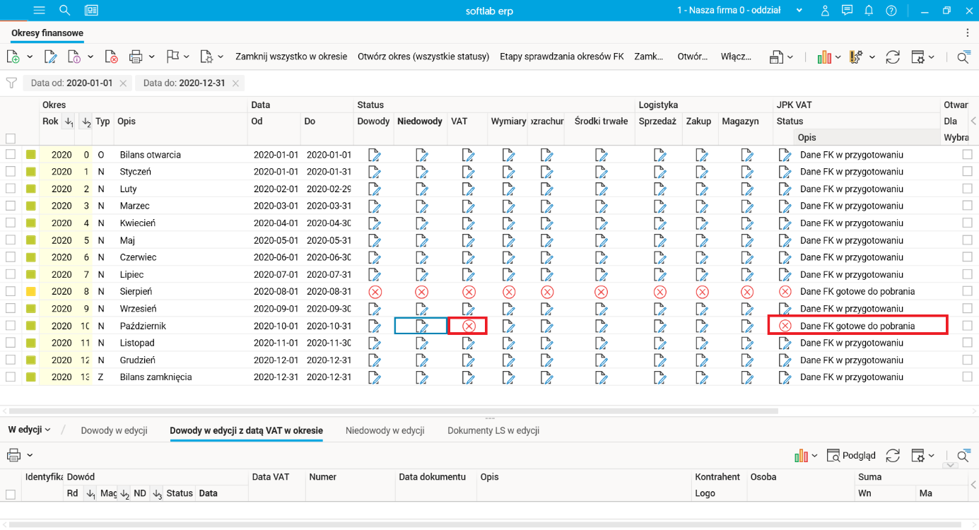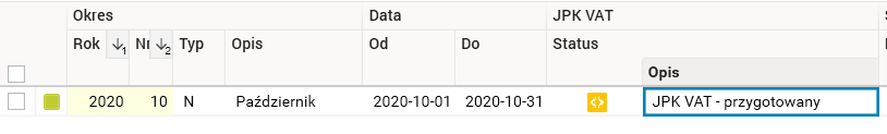 Dla takiej wartości statusu wszystkie dokumenty posiadające datę VAT z okresu od 2020-10-01 do 2020-10-31 mogą być dopisywane, edytowane i usuwane według zasad obowiązujących dotychczas w systemie, aż do momentu zamknięcia okresu VAT.