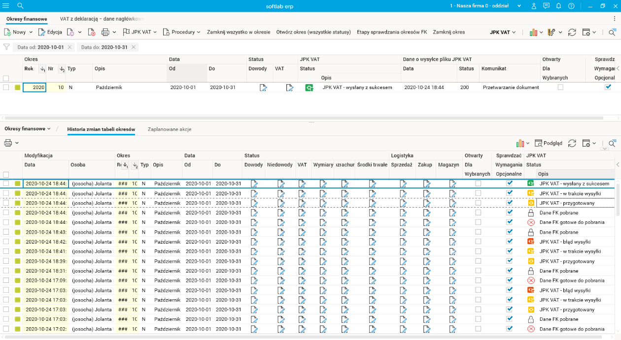 Szczegół Historia zmian tabeli okresów rozszerzono o nową kolumnę JPK VAT;Status. Wszelkie zmiany tego statusu są rejestrowane w tym szczególe i umożliwiają śledzenie historii zmian tego statusu.