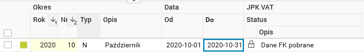 Gdy ewidencja VAT za październik 2020 roku będzie gotowa do wysyłki do modułu JPK VAT, przed przygotowaniem pliku JPK VAT za dany okres należy zamknąć okres VAT. Po zamknięciu okresu VAT automatycznie zmieni się wartość kolumny JPK VAT;Status na Dane FK gotowe do pobrania.