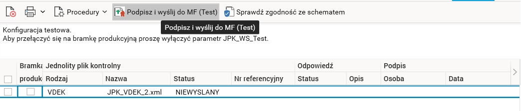 · JPK VAT wysłany z sukcesem – status ustawiany automatycznie po użyciu procedury Podpisz i wyślij dostępnej w module JPK (tylko gdy jest to wykonane na bramce produkcyjnej i otrzymano prawidłową odpowiedź o przyjęciu pliku (200)).
