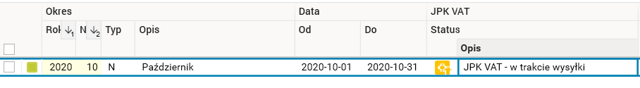 Po wysyłce pliku na bramkę Ministerstwa Finansów (procedura Podpisz i wyślij do MF w słowniku VAT z deklaracją – dane nagłówkowe) dany okres finansowy w kolumnie JPK VAT;Status będzie miał wartość JPK VAT w trakcie wysyłki.