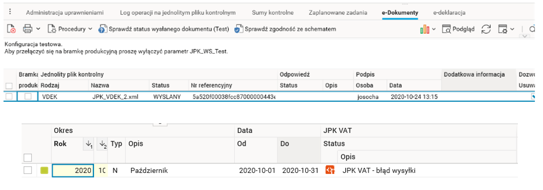 · JPK – błąd wysyłki – status ustawiany automatycznie po użyciu procedury Podpisz i wyślij dostępnej w module JPK (tylko gdy jest to wykonane na bramce produkcyjnej i otrzymano komunikat o statusie <>200).