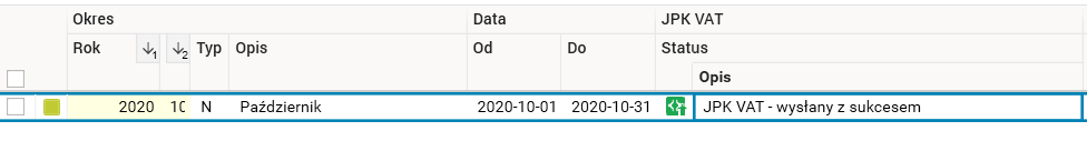 Rys. Słownik Okresy finansowe, status JPK VAT – wysłany z sukcesem
