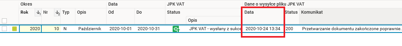 W zależności od powodzenia wysyłki i otrzymania kodu 200, dany okres w kolumnie JPK VAT;Status będzie miał wartość JPK VAT – wysłany z sukcesem lub JPK VAT – błąd wysyłki (procedura Sprawdź status wysłanego dokumentu w słowniku VAT z deklaracją – dane nagłówkowe).