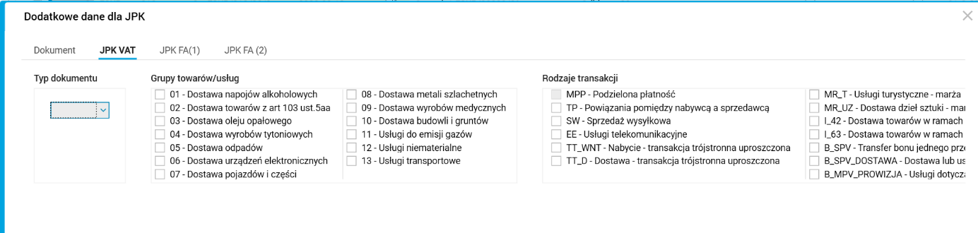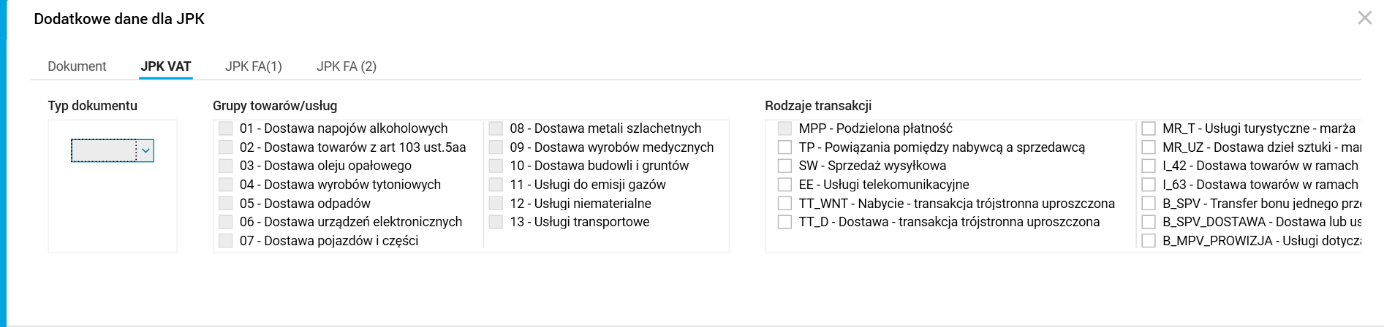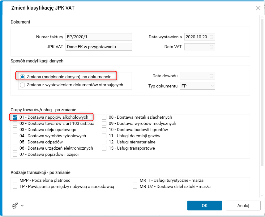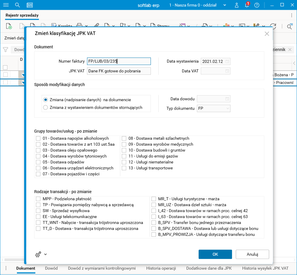W tym trybie dane związane z klasyfikacją JPK VAT, czyli kody grup GTU i rodzaje transakcji, mogą być zmieniane w następujący sposób: