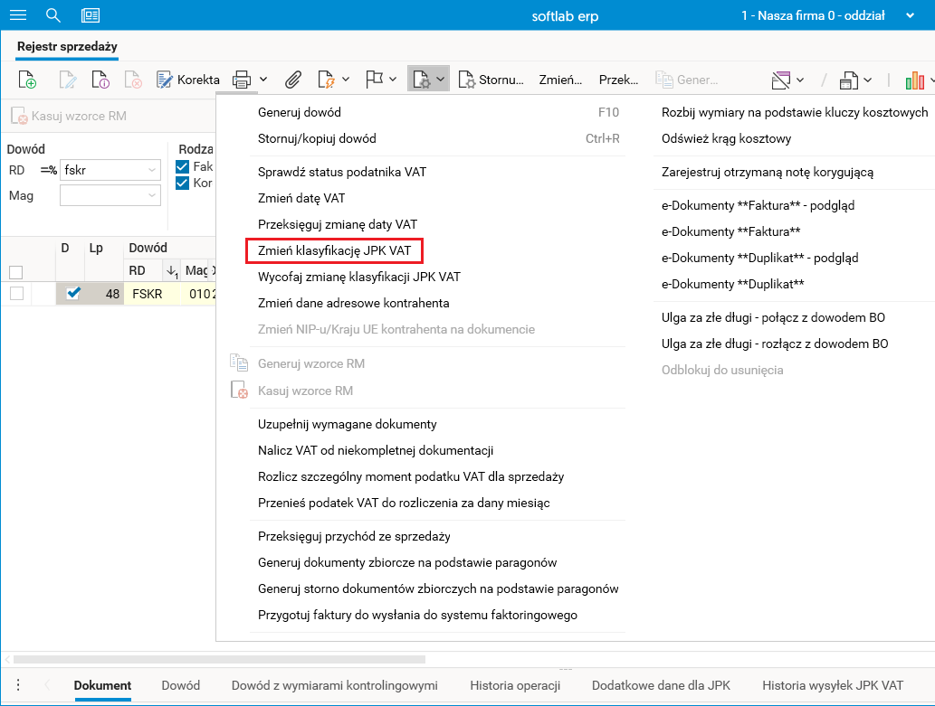 Procedura Zmień klasyfikację JPK VAT w słowniku Rejestr sprzedaży umożliwia zmianę takich elementów jak: