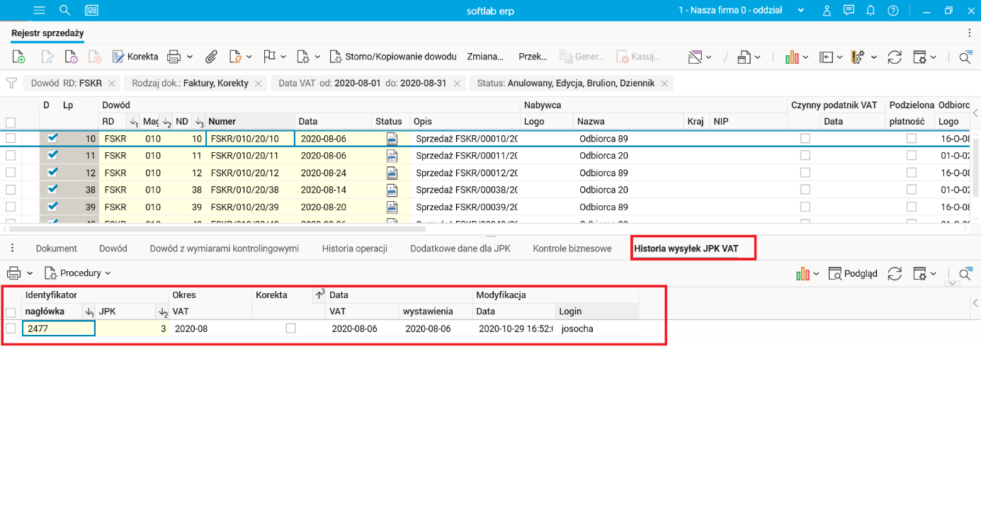 O tym, czy dokument był już wysłany do JPK świadczy wpis w szczególe Historia wysyłek JPK VAT dostępnym w słowniku Rejestr sprzedaży lub Rejestr zakupów.