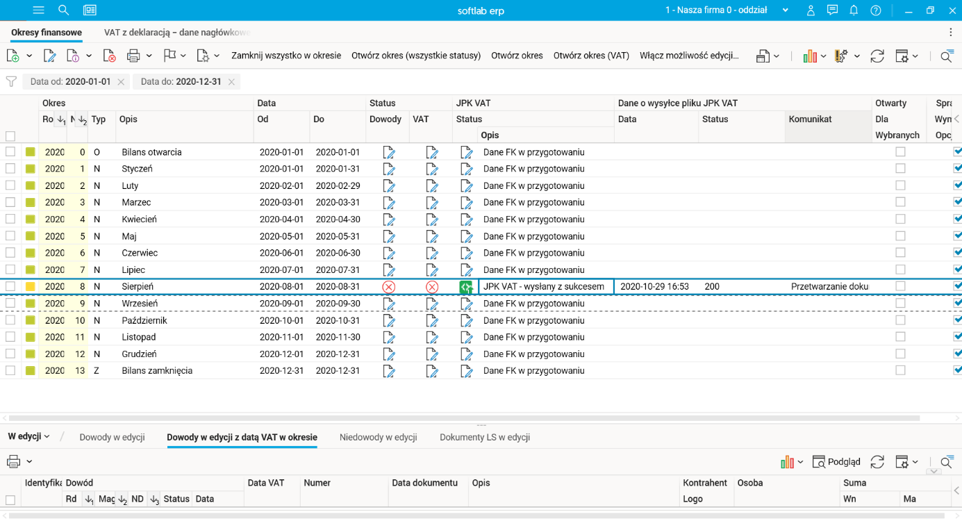 Możliwość wprowadzania zmian w dokumentach pojawi się dopiero, gdy plik JPK VAT zostanie wysłany na bramkę produkcyjną MF i otrzymamy komunikat 200 (wysyłka zakończona sukcesem). Wówczas status JPK VAT w słowniku Okresy finansowe zostanie ustawiony automatycznie na wartość JPK VAT wysłany z sukcesem, a obok statusu pojawi się data zakończonej wysyłki. Okres VAT nadal pozostanie zamknięty.