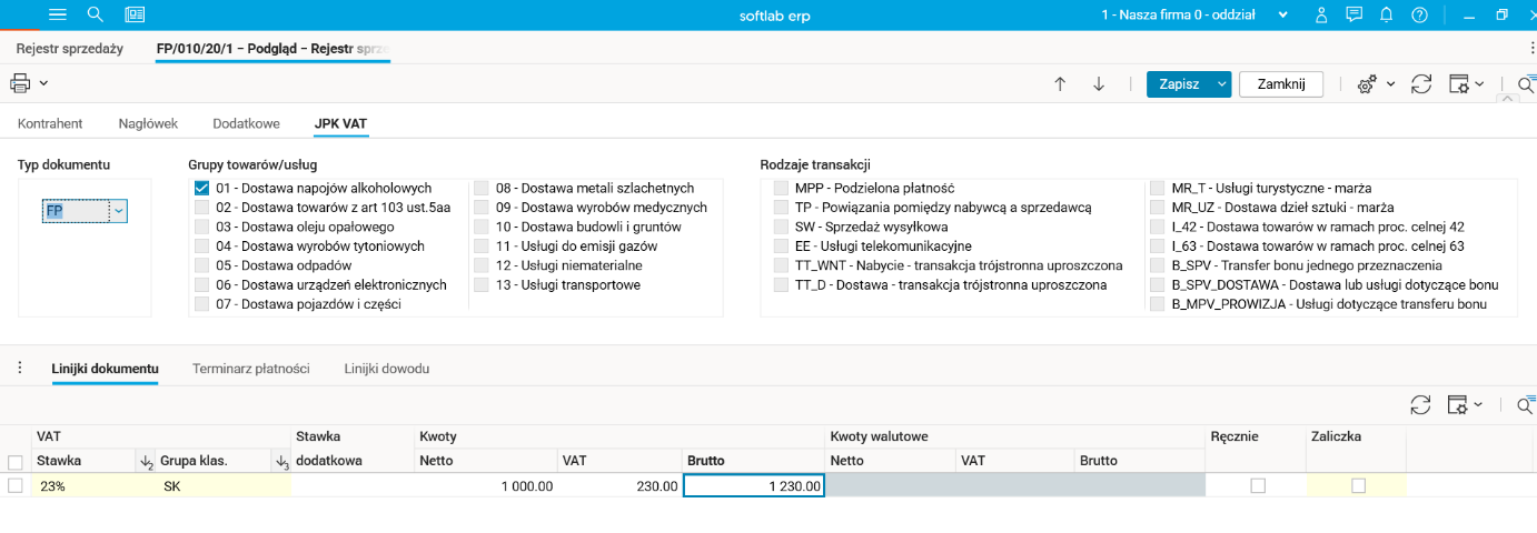 Faktura sprzedaży FP/2020/1 nie została opatrzona kodem GTU01. Dokument nie został jeszcze uwzględniony w JPK VAT. Aby uzupełnić ten kod, w słowniku Rejestr sprzedaży odszukujemy dany dokument i uruchamiamy procedurę Zmień klasyfikację JPK VAT. W parametrach zaznaczamy opcję Zmiana (nadpisanie) danych na dokumencie oraz grupę 01 – Dostawa napojów alkoholowych. Po zatwierdzeniu procedury, dane JPK VAT w zakresie grup towarów i usług zostaną zaktualizowane na wskazanym dokumencie.