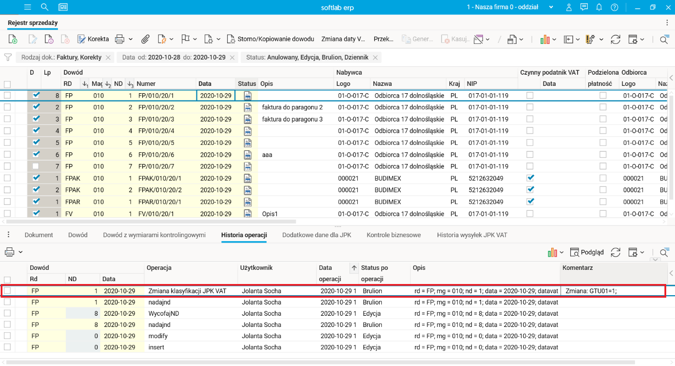 Zostanie również wykonany odpowiedni wpis w słowniku Rejestr zakupów w szczególe Historia operacji.