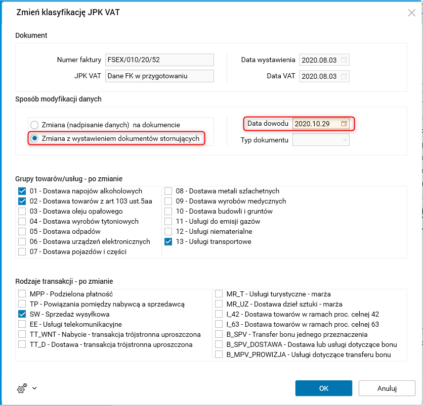 Dokumenty stornujące przed anulowaniem dokumentu można wygenerować procedurą Zmień klasyfikację JPK VAT, nie zmieniając danych w parametrach procedury.