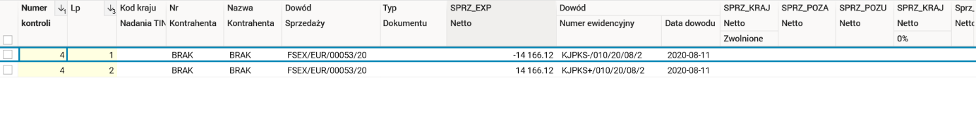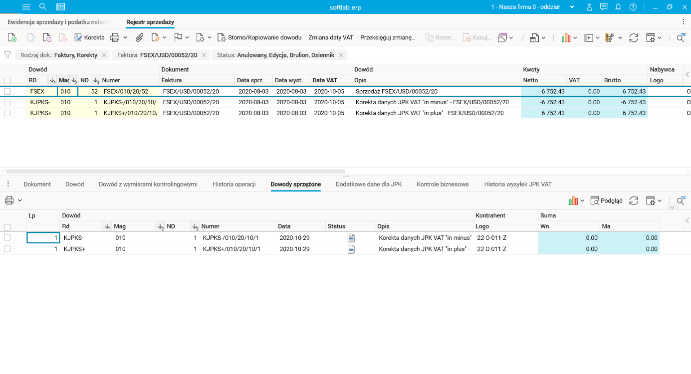 · drugi zawiera aktualne dane z dokumentu i kwoty z odwrotnym znakiem (storno na minus) – dokument KJPKS-.