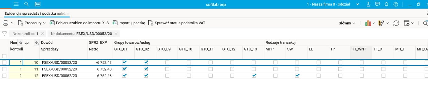 Jeśli po takiej modyfikacji zostanie przygotowana korekta pliku JPK VAT, to w słowniku Ewidencja sprzedaży i podatku należnego faktura FSEX/USD/00052/20 jest wykazana trzy razy.