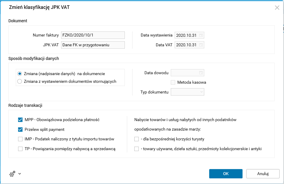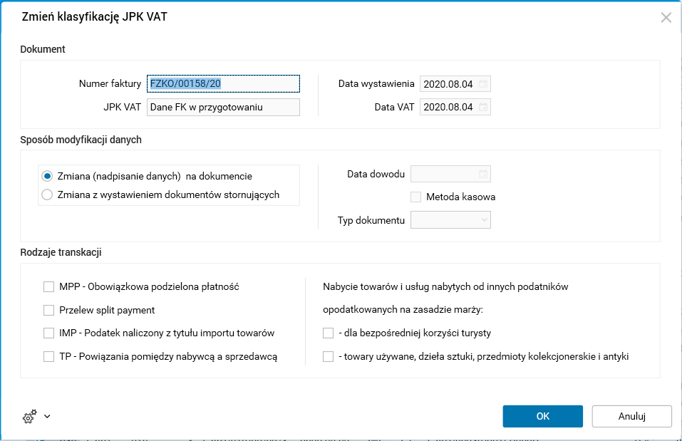 Sposób dokonania korekty danych jest uzależniony od tego, czy dany dokument został już umieszczony w pliku JPK VAT, czy też nie. Jeśli dokument nie był jeszcze wysłany w JPK VAT, to można dokonać korekty danych JPK VAT poprzez ich nadpisanie na dokumencie nowymi wartościami podanymi w parametrach procedury.