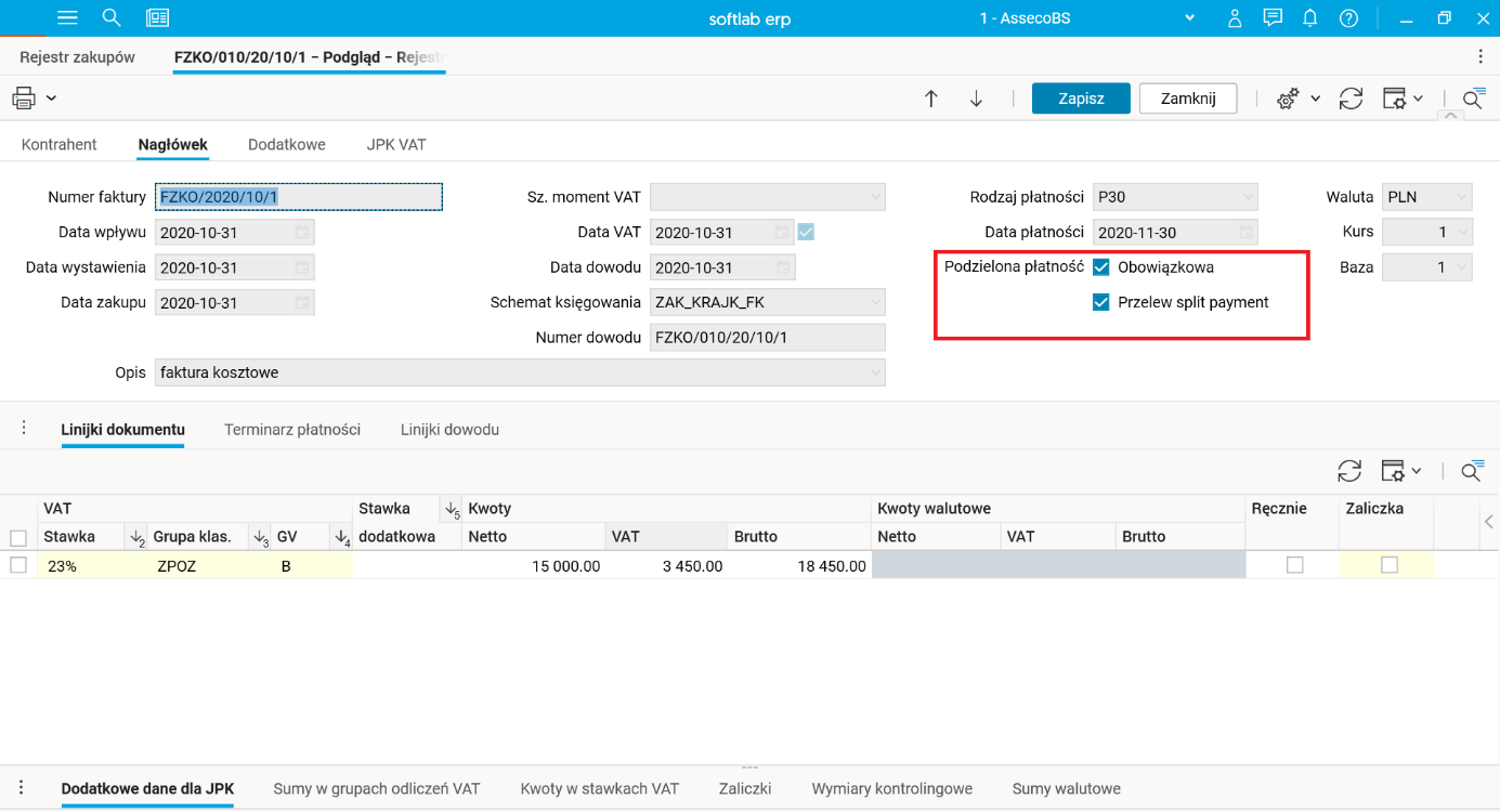 Zarejestrowano fakturę kosztową FZKO/2020/10/1 na kwotę 18450 zł. Przez pomyłkę nie zaznaczono znacznika MPP – Obowiązkowa podzielona płatność. Błąd zauważono za jakiś czas, przed wygenerowaniem przelewu oraz przed wysyłką JPK VAT za październik 2020. Aby naprawić pomyłkę, uruchamiamy procedurę Zmień klasyfikację JPK VAT z parametrami jak poniżej.