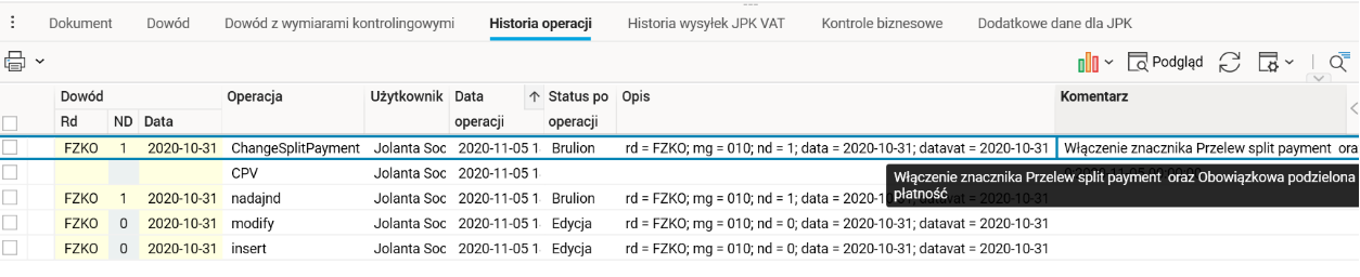 Jednocześnie w historii operacji zostanie dodany wpis z informacją o dokonanej zmianie.