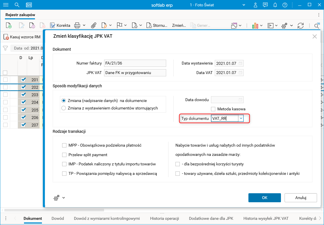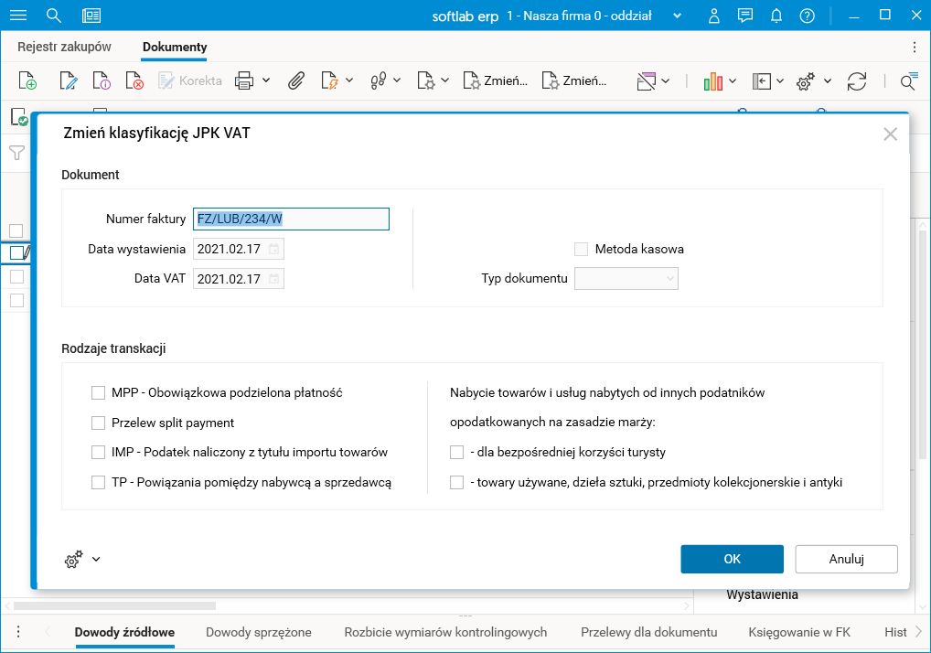 Procedura Zmień klasyfikację JPK VAT umożliwia również zmianę typu dokumentu. Zmiana ta jest jednak możliwa przy odpowiedniej konfiguracji zmienianego rodzaju dowodu.