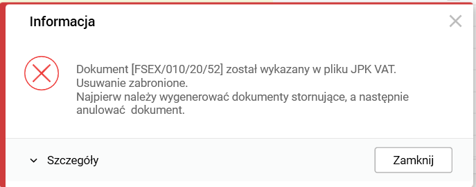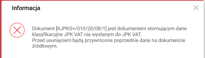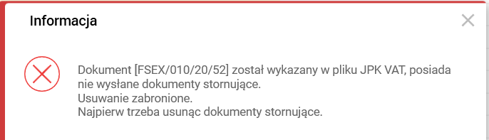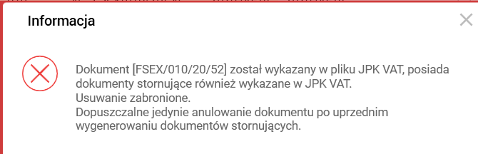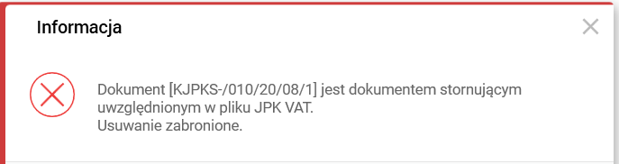 · Usuwany dokument jest dokumentem stornującym wykazanym w kontroli JPK VAT w słowniku Vat z deklaracją – dane nagłówkowe. Dokument nie może zostać usunięty.