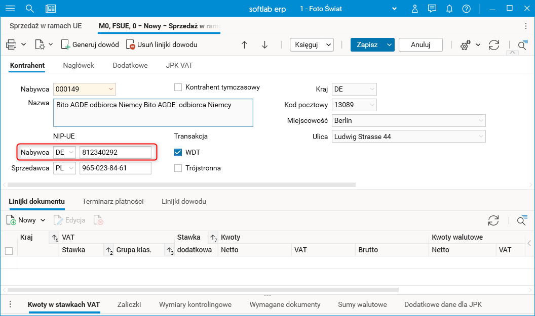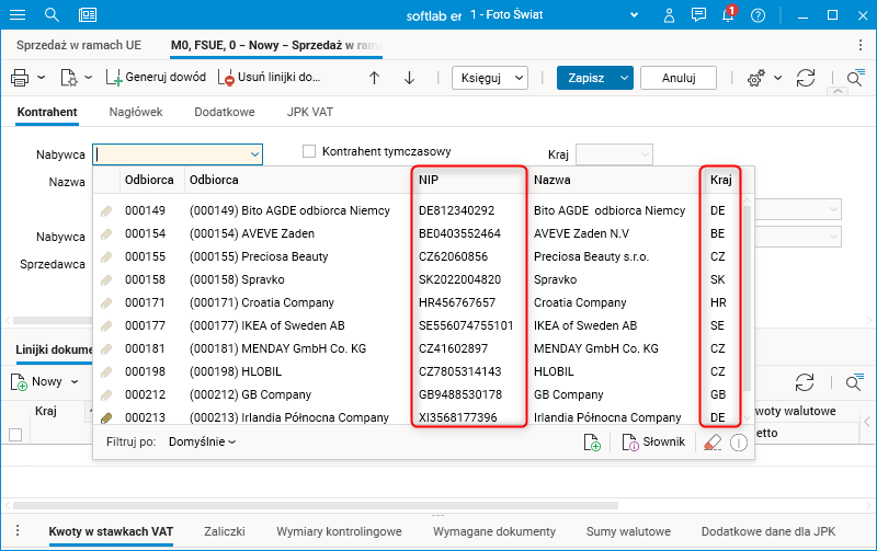 Wybór kontrahenta z listy powoduje odpowiednie wypełnienie pól. W szczególności kod kraju i podatkowy numer identyfikacyjny wyświetlane są w dwóch różnych polach.