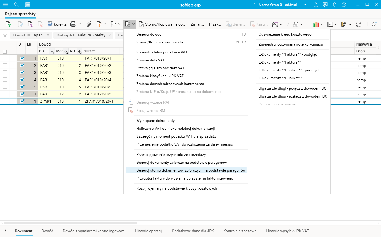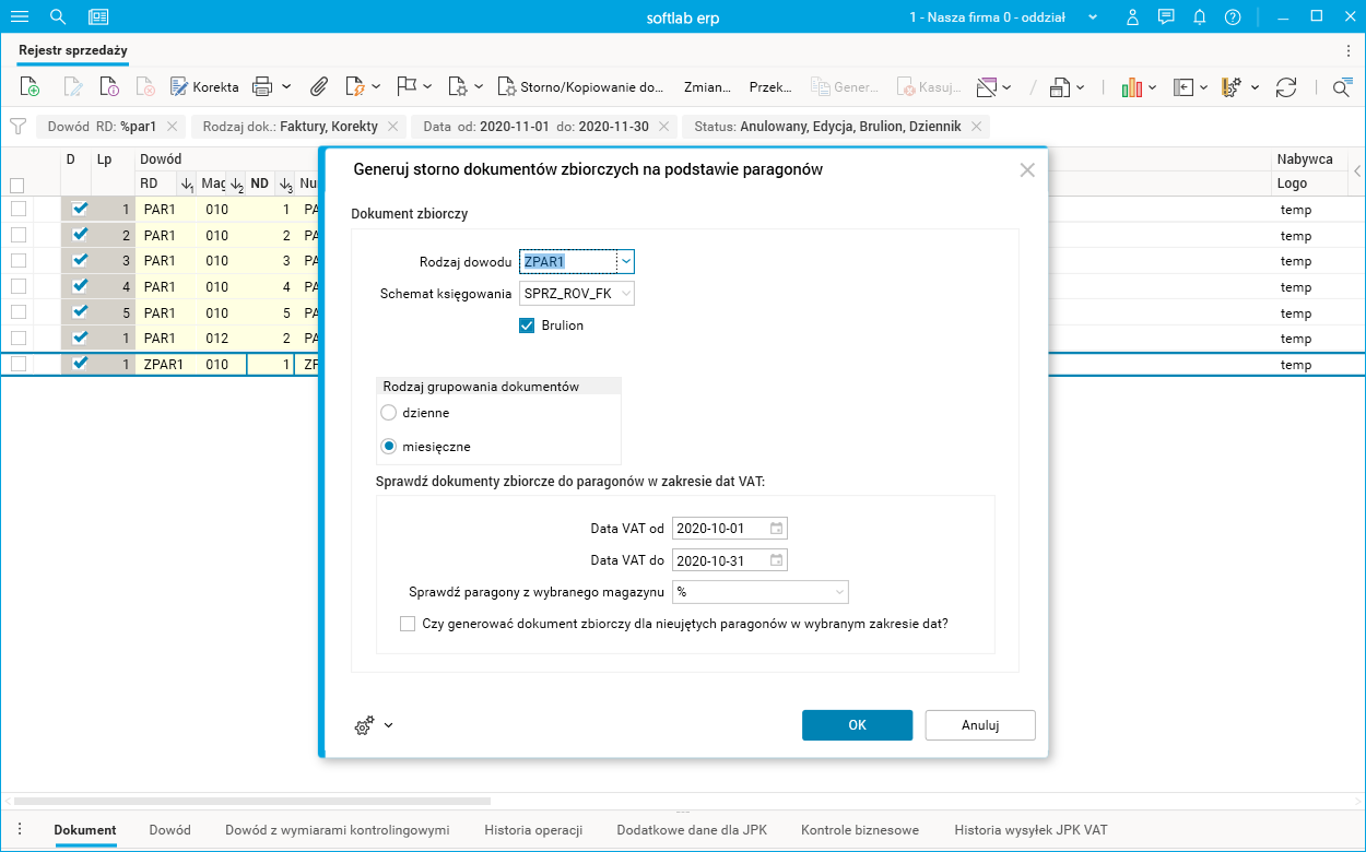 W systemie Softlab ERP w słowniku Rejestr sprzedaży dodano procedurę Generuj storno dokumentów zbiorczych na podstawie paragonów. Pozwala ona wystornować paragony nieprawidłowo ujęte według daty VAT na dokumentach zbiorczych ZPAR.