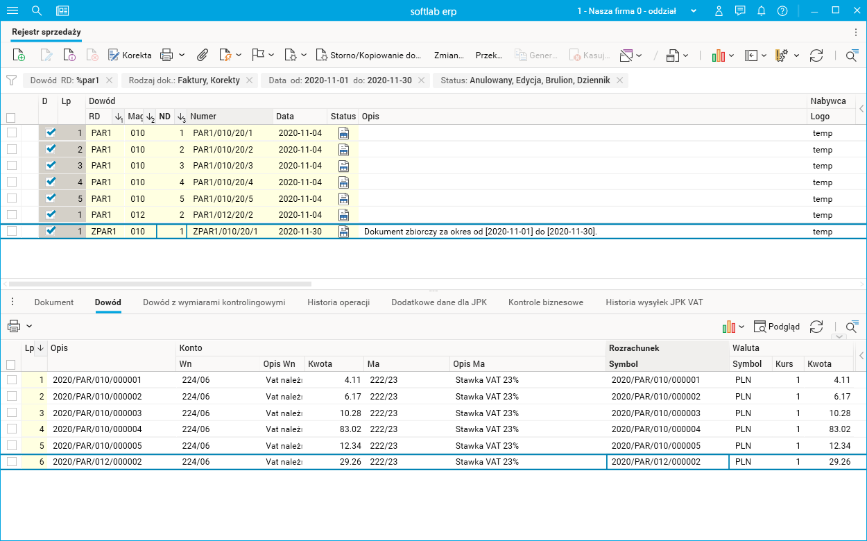Wystawiono paragony PAR1. Paragony za listopad zostały ujęte w dokumencie zbiorczym ZPAR1/010/20/1.