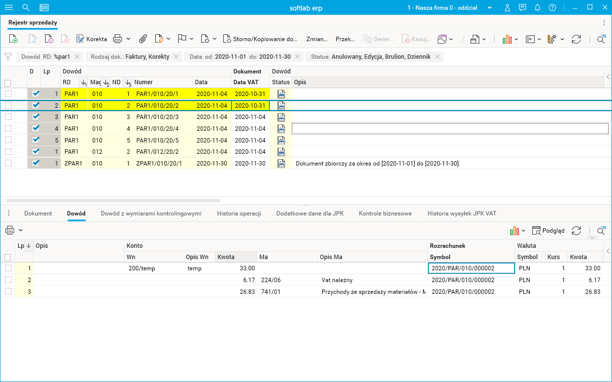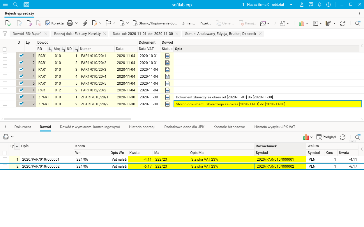 Dla paragonów PAR1/010/20/1 i PAR1/010/20/2 zmieniono datę VAT na 2020-10-31.
