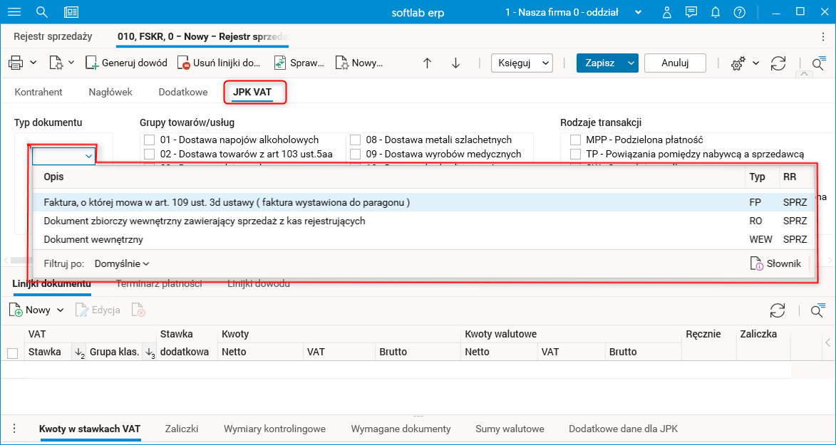 Rys. Pole Typ dokumentu w szczególe Dodatkowe dane dla JPK – Rejestr sprzedaży