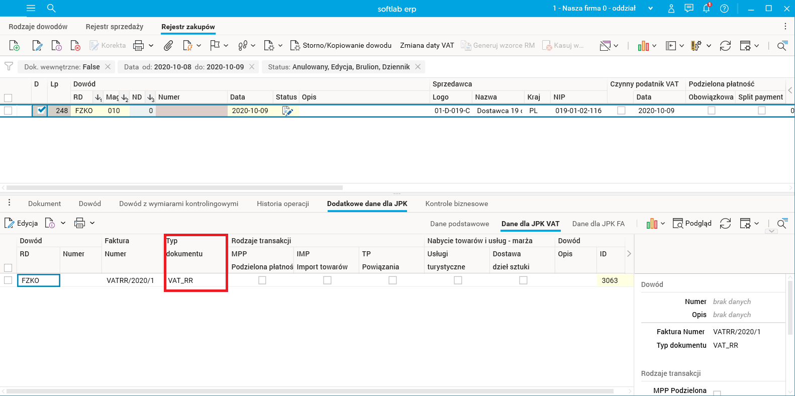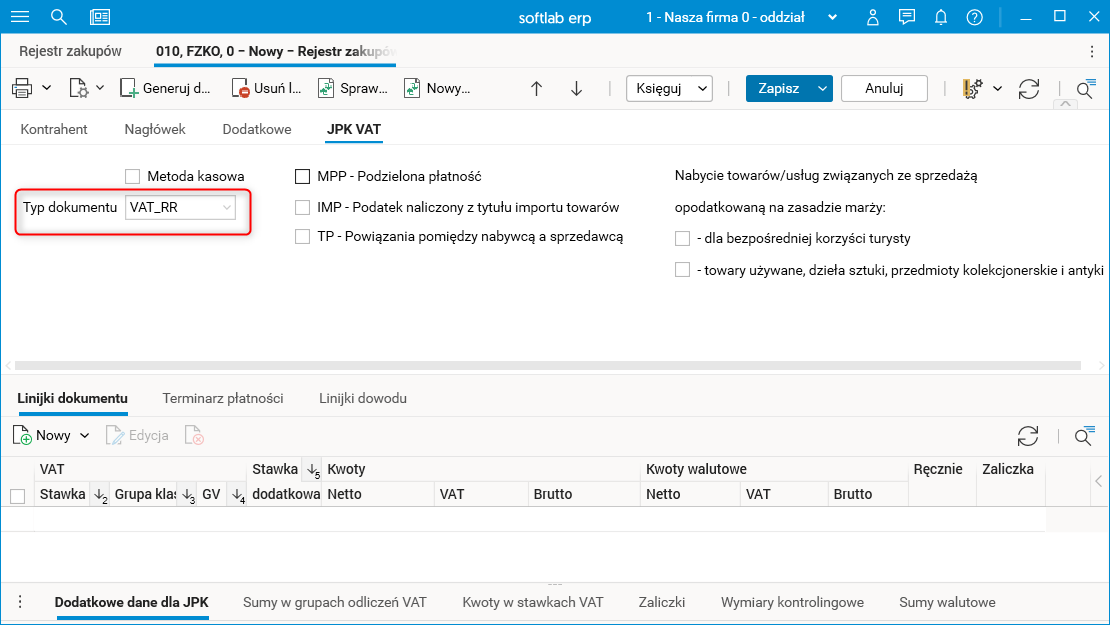Rys. Pole Typ dokumentu w szczególe Dodatkowe dane dla JPK – rejestr zakupów