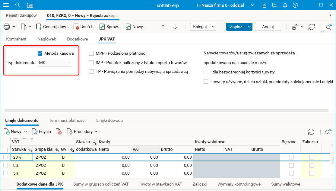 Obsługa metody kasowej i typu dokumentu MK