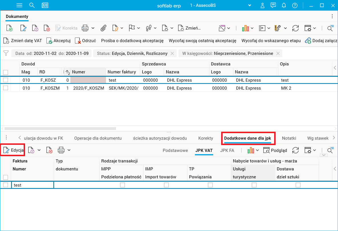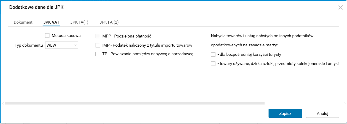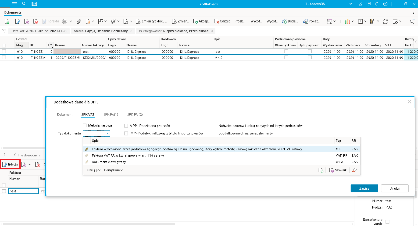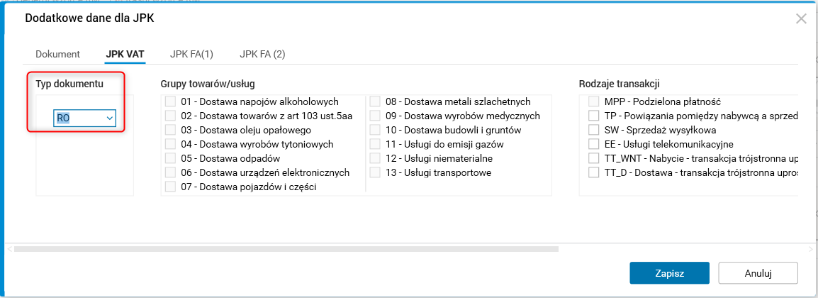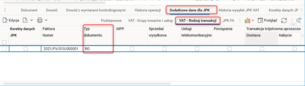 Edycja danych dodatkowych JPK – typ dokumentu