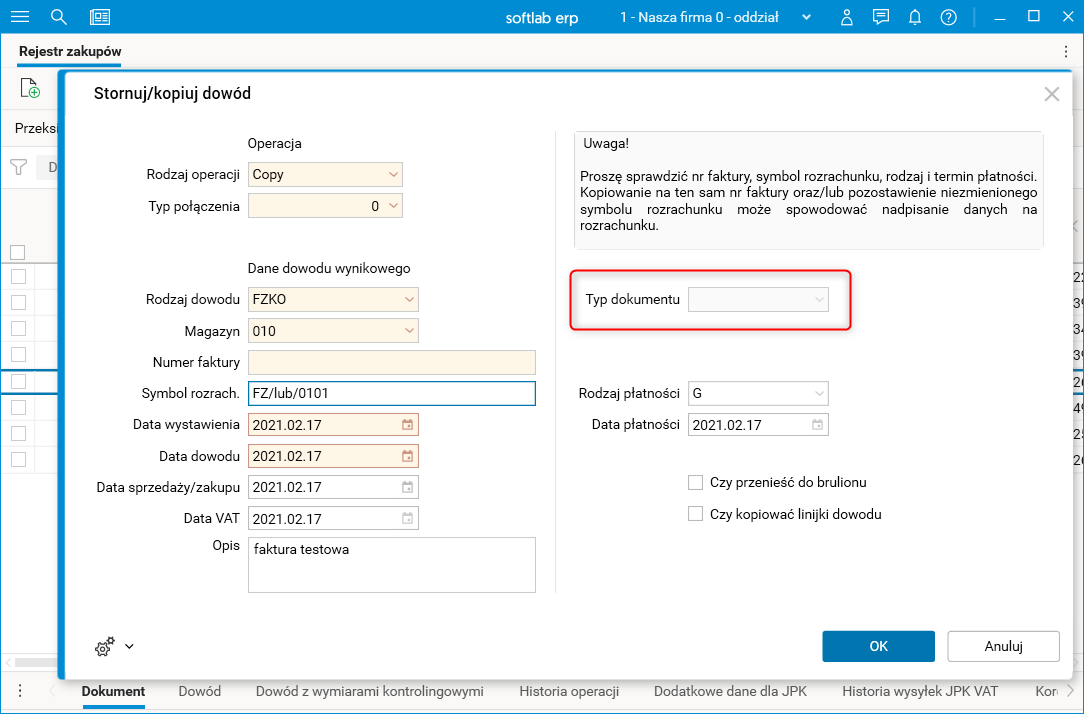 W parametrach procedury Stornuj/kopiuj dowód wybieramy ten sam rodzaj dowodu, czyli FZKO. Skopiowany dokument będzie posiadał pusty Typ dokumentu (zgodnie z ustawieniami na rodzaju dowodu FZKO). Parametru Typ dokumentu nie można zmienić, ponieważ konfiguracja na rodzaju dowodu nie pozwala na jego modyfikację.