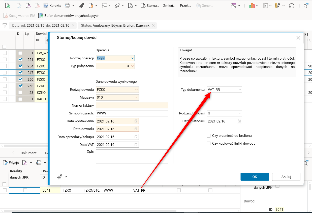 W parametrach procedury Stornuj/kopiuj dowód wybieramy ten sam rodzaj dowodu, czyli FZKO. W parametrach procedury podpowie się typ dokumentu VAT_RR (zgodnie z dokumentem kopiowanym). Zainicjowaną wartość możemy zmienić.