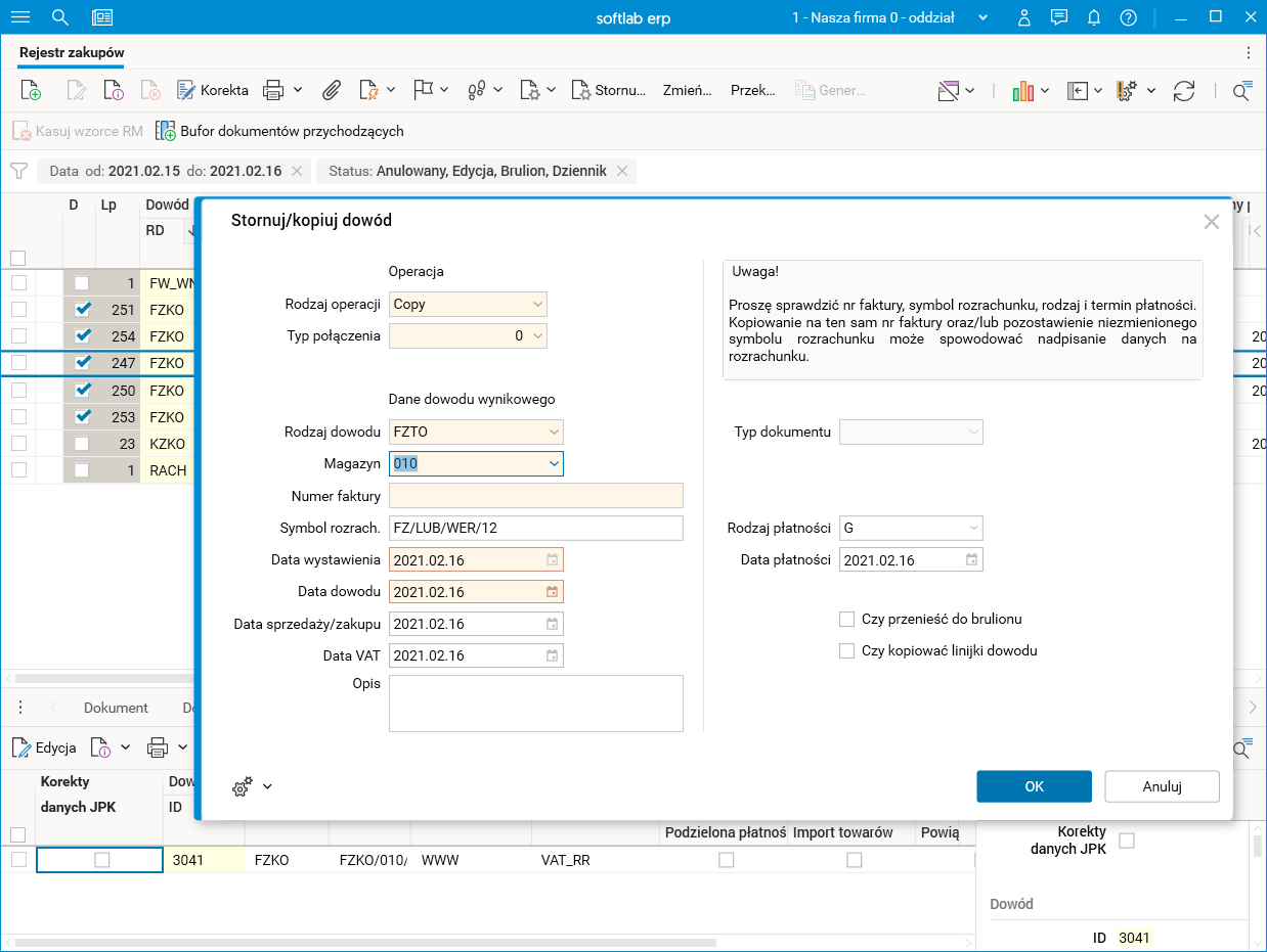 Procedurę Stornuj/kopiuj dowód dostępną w słownikach Rejestr zakupów i Rejestr sprzedaży rozbudowano o nowy parametr Typ dokumentu.