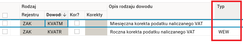 ·        WEW – w przypadku dokumentu wewnętrznego, np. dokonanie rocznej korekty podatku naliczonego w związku ze zmianą współczynnika odliczenia podatku naliczonego.
