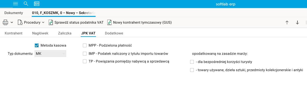 Oznaczenie typu dokumentu MK jest obsługiwane nieco inaczej, ze względu na jego powiązanie z polem P_16 w Jednolitym Pliku Kontrolnym dla faktur sprzedaży (struktura JPK FA).