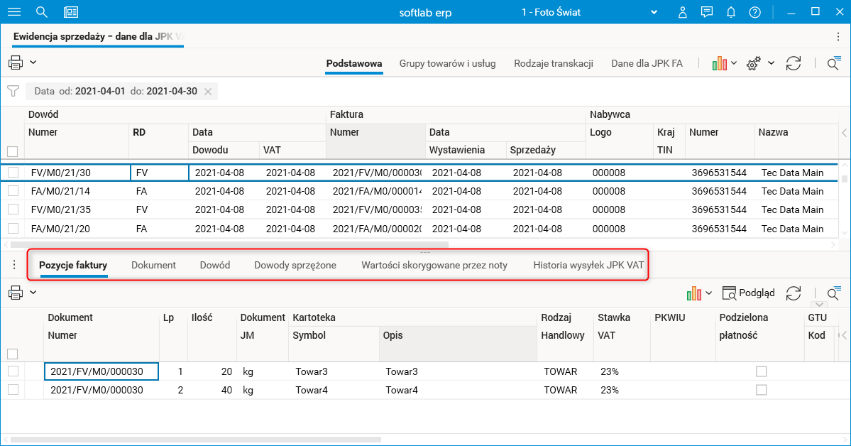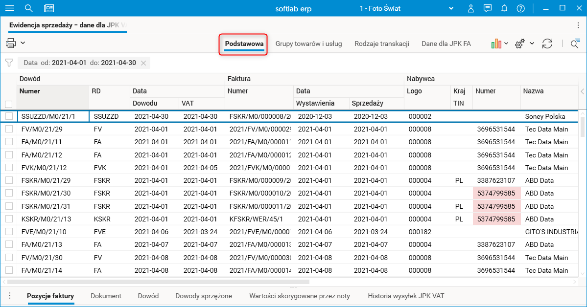 ·        Ewidencja sprzedaży – dane dla JPK VAT – zawiera informacje pochodzące z nagłówków dokumentów sprzedaży oraz ze szczegółu Dodatkowe dane dla JPK.