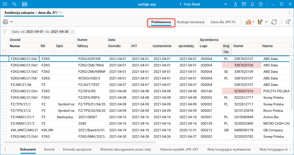 ·        Ewidencja zakupów – dane dla JPK VAT – zawiera informacje pochodzące z nagłówków dokumentów zakupowych oraz ze szczegółu Dodatkowe dane dla JPK.