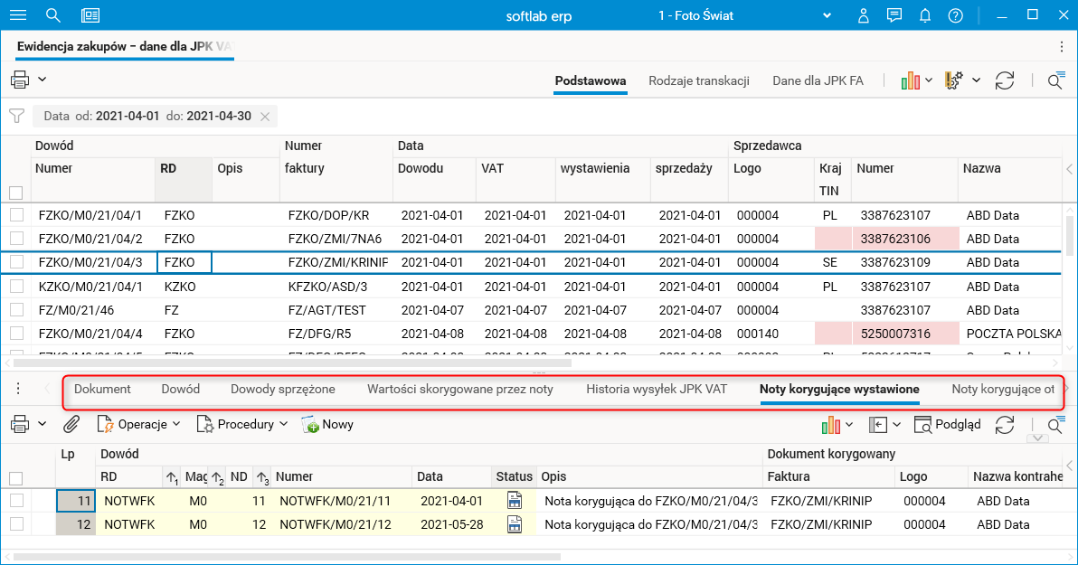 ·        Dowody sprzężone – zawiera dokumenty powiązane (sprzężone), w tym korekty danych JPK,