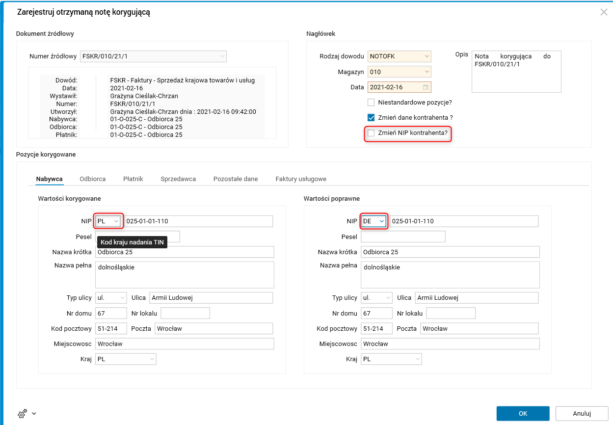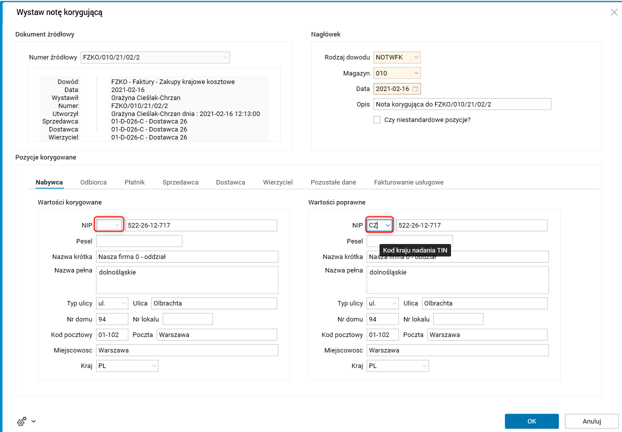 W oknie parametrów procedury Zarejestruj otrzymaną notę korygującą przed numerem NIP w sekcjach Wartości korygowane i Wartości poprawne dodano pole Kod kraju nadania TIN. Pole to występuje w zakładkach: Nabywca, Odbiorca, Płatnik oraz Sprzedawca.