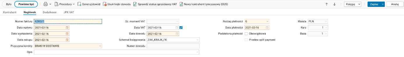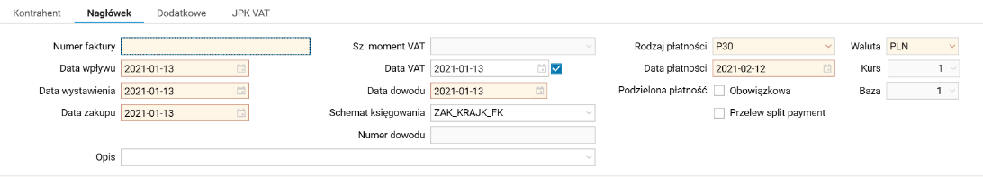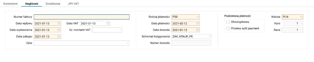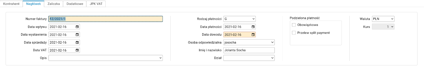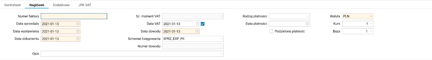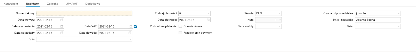 ·        Nagłówek – zakładka zawiera numer faktury i jej opis, daty, informacje związane z walutą oraz płatnością.